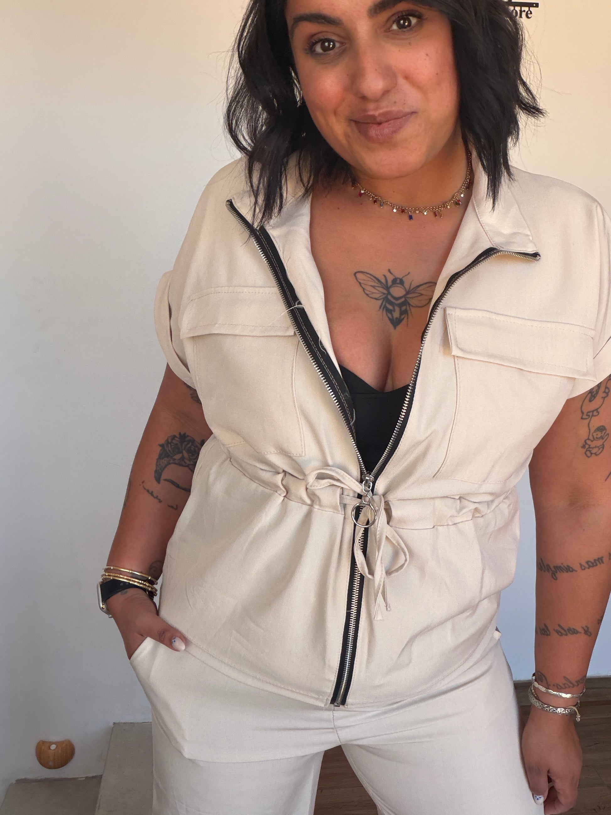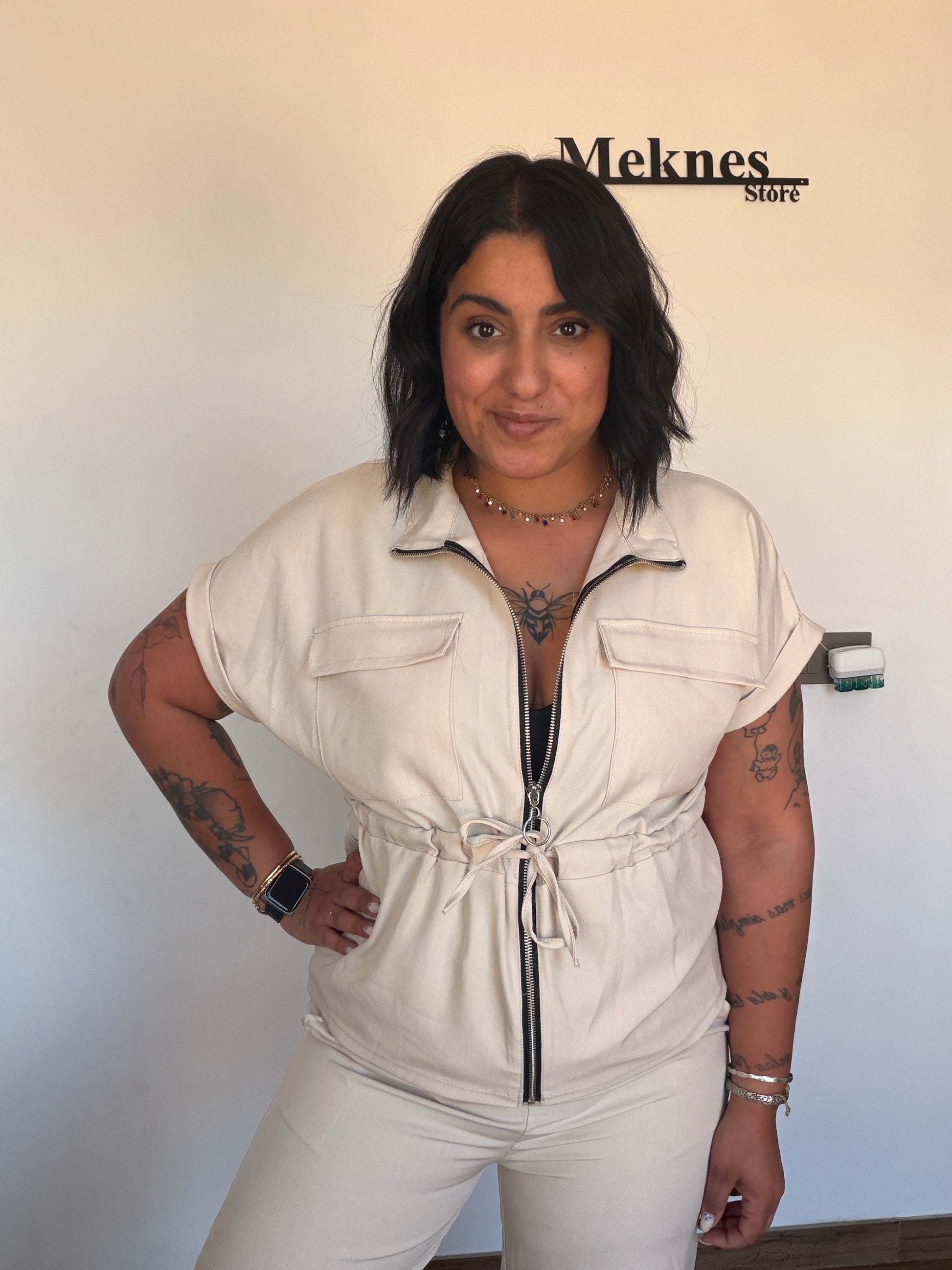 El conjunto Safari Set en tono beige es la combinación perfecta entre comodidad y estilo urbano. Incluye pantalón de corte relajado y chaqueta ligera con cremallera frontal y ajuste en la cintura que realza la silueta de forma favorecedora. Su diseño versátil permite llevarlo tanto cerrado como abierto, adaptándose a diferentes looks.
